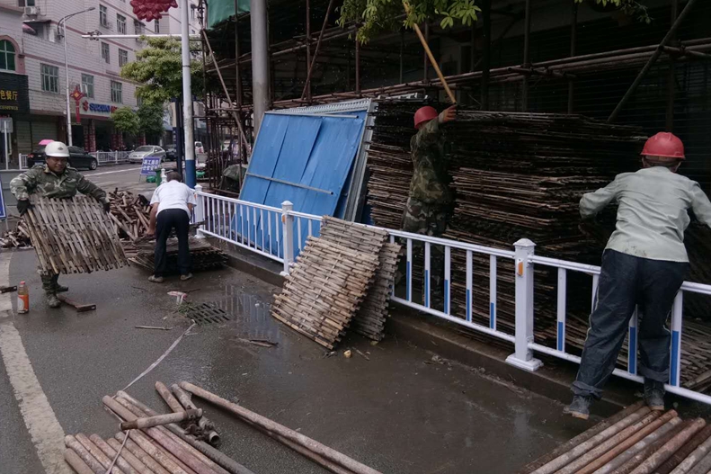 2018年5月31日,暴雨不断。县行政执法局在巡查中发现国土大厦立面改造施工现场,钢管等建筑器材大量堆放在主街机动车道上,在大雨中市民骑车雨衣雨伞遮挡、路面湿滑、行车匆匆,极易引发交通事故。