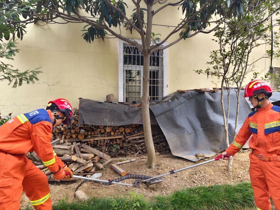 到场后,消防员发现一条约3米长、近10斤重的眼镜王蛇(俗称“过山峰”)藏于房前木材缝隙。两名消防员协同操作,一人用工具拨杂物并照明定位,另一人以捕蛇夹精准控蛇,第三人配合将蛇装入编织袋。12时20分,蛇被成功捕获,随后被带至远离居民区的山林放生。