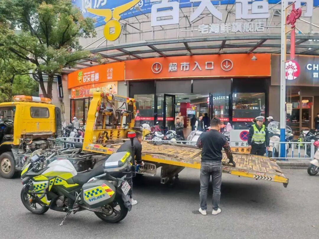 11月6日,在朝阳街百大超市路段,县公安局交管大队民辅警对路边停车行为进行劝阻,借助清障车将违章乱停放的摩托车拖离。