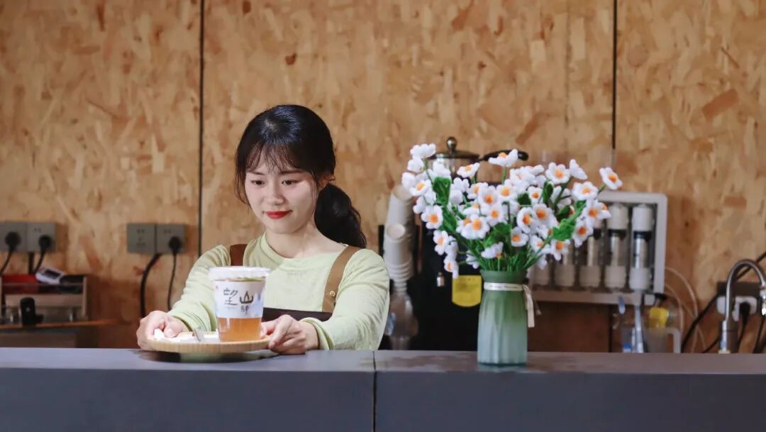 ▲石屯镇王山口村 郭斯杰 摄 这便是返乡青年孙榅棋经营的“望山驿”奶茶店,也是她在故乡播种创业理想的“试验田”。见到孙榅棋时,她正忙着为顾客调制奶茶,空气中弥漫着茉莉花香与奶香交织的清甜。