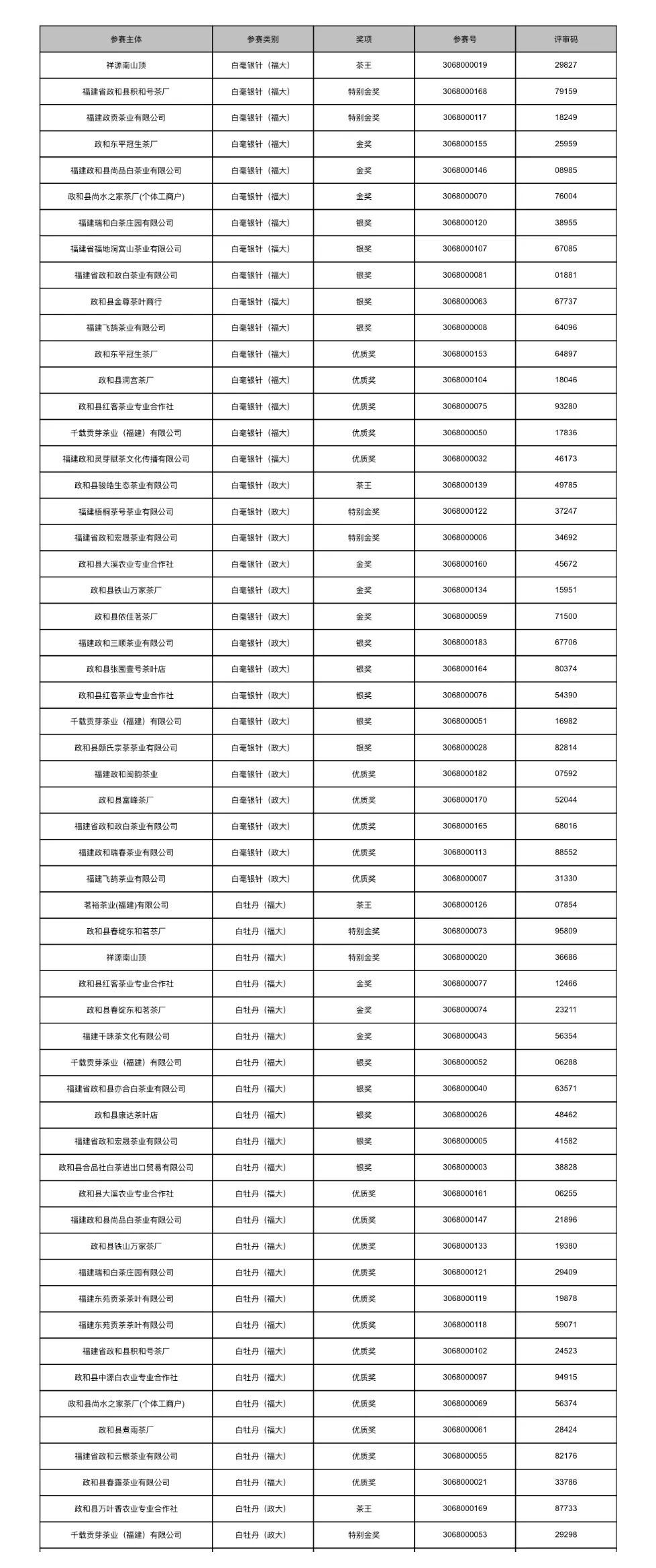 按照客观、公正、公开的原则,评审专家们围绕参赛茶样的外形、汤色、香气、滋味、叶底五大关键维度进行细致品鉴、综合打分。评选出白毫银针(福大)、白毫银针(政大)、白牡丹(福大)、白牡丹(政大)、贡眉等各组茶王、特别金奖、金奖、银奖和优质奖,获奖结果在中国白茶城毛茶交易大厅现场揭晓。