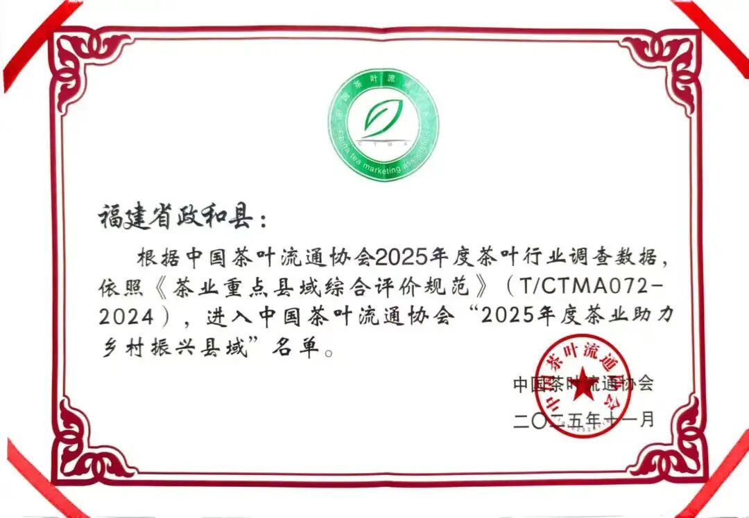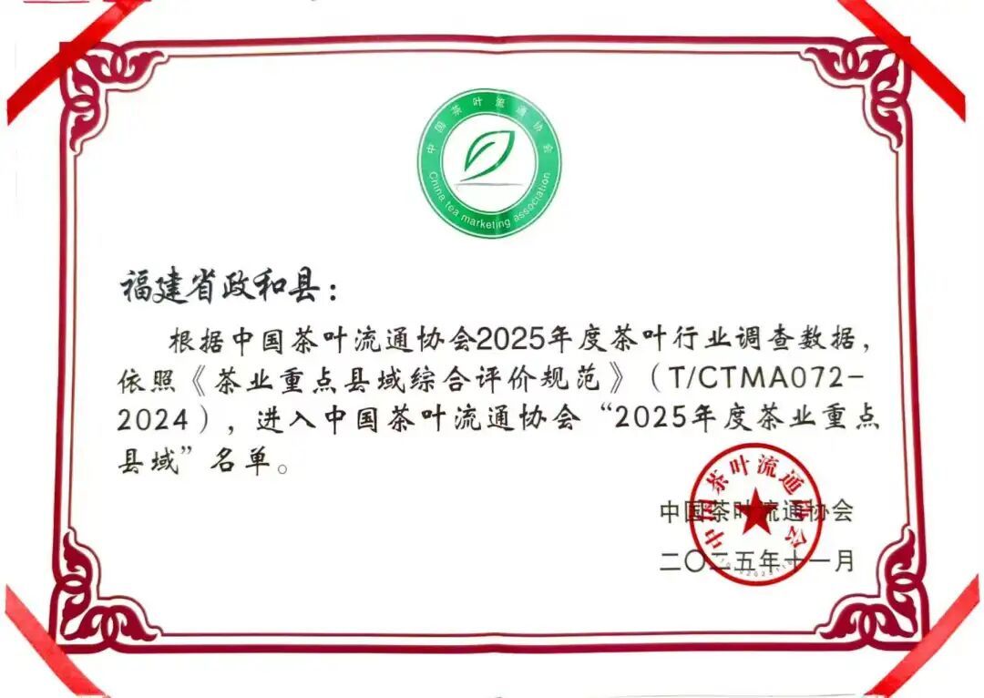 11月27日,第二十一届中国茶业经济年会在浙江新昌成功举办。会上,政和县荣获“2025年度茶业重点县域” “2025年度茶业助力乡村振兴县域”等荣誉称号,至此,政和县已连续六年获评“茶业重点县域”。