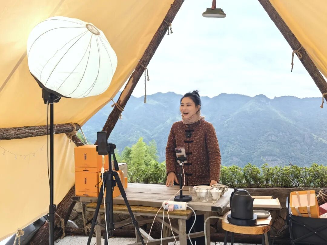 黄林鑫设置的户外直播棚,背景是连绵的佛子山。 “刚直播时,经常有人怀疑我的背景是假的,我就带着大家四处转转,看着村里的美景。”黄林鑫向记者解释说,看了稠岭的风景,许多观众对高山白茶的产地有了概念。 别看现在说得头头是道,六年前刚回到政和时,黄林鑫对直播是个“门外汉”。 作为土生土长的政和人,黄林鑫伴着家中茶厂的茶香成长,打下了茶叶制作工艺的基础;南下广州经营茶叶,让她对茶叶销售推广有了更深的理解。 2019年,黄林鑫敏锐地发现,线上直播正成为茶企的对外展销新窗口。当时正好村干部发来消息,问她有没有兴趣返乡创业,这让远在异乡的黄林鑫回想起家乡的优势。“这里海拔高,不仅产出的高山白茶质量好,还有得天独厚的自然美景。如果直播里有这些风景,一定很震撼。”抱着这样的想法,她毅然回到政和,投身线上直播的新天地。 返乡初期,黄林鑫坚持每天开播,直播间里却始终冷冷清清。“但售出的茶叶基本没有退货或差评,我相信自家的产品质量是站得住脚的。”为了提升直播间的吸引力,她不断研究热门直播间的优点,改善自己的不足,一同返乡的丈夫江翔翔则专注管理茶厂,为产品把好质量关。