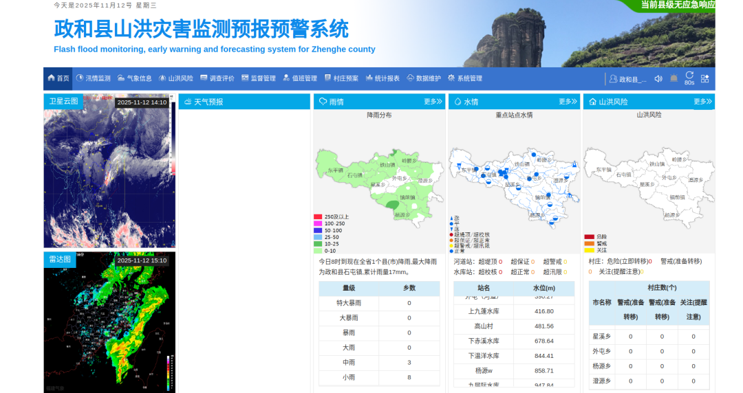 ▲山洪灾害监测预报预警系统 绘就水清岸绿的“生态画卷” 以河湖长制作为我县生态文明建设的重要抓手,积极探索“上下游、左右岸、前后任、一盘棋”的联动治水格局,印发《政和县河湖长制巡河交水工作制度》等一系列工作制度,构建“县乡村”三级巡河交水体系;建立“清四乱”常态化治理机制,累计完成部、省图斑复核整改问题销号519个,自主巡查发现问题整治2113个,实现河湖岸线环境持续优化;创新跨省市协同治水,建立健全跨省市河长制联防联控联治机制,与毗邻的县市成立跨区域治水协作共同体,聘请28名企业、民间和政协委员河长,强化拓展巡河交水覆盖面,实现全流域Ⅱ类水以上目标,绘就美丽幸福河湖新画卷。