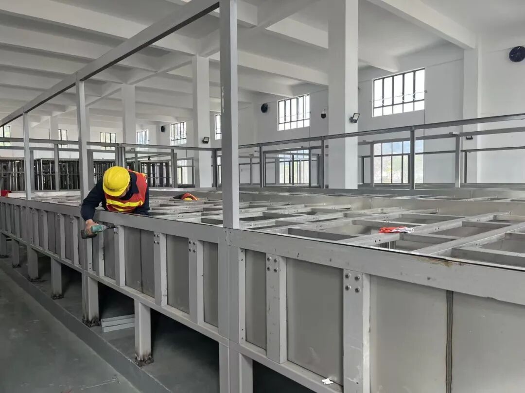 12月25日,在位于政和县东平镇的城乡供水一体化建设项目点上,工人们正在膜处理车间安装水箱框架。