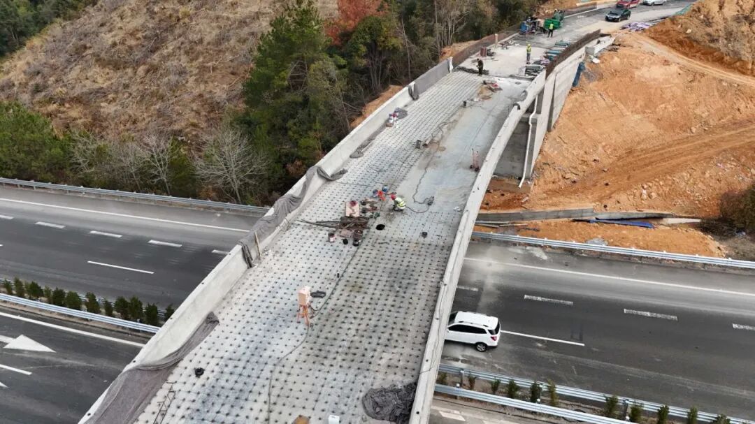 “临近年底,项目正全力推进连接线(三级公路)石方开挖及路面工程;高速互通段同步开展混凝土防撞护栏浇筑、路床修整及跨高速52米钢箱梁桥面道钉焊接施工。”泉州市华泰建设工程有限公司项目经理张移捷介绍,该项目于2024年5月正式开工,截至目前,已完成总工程量的77%。