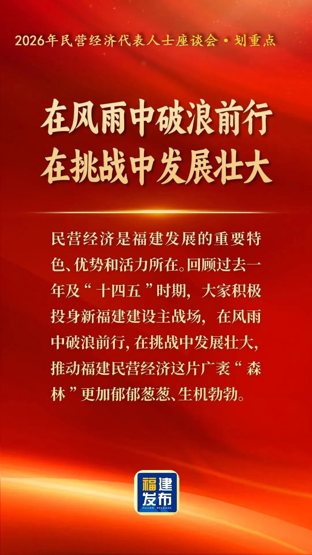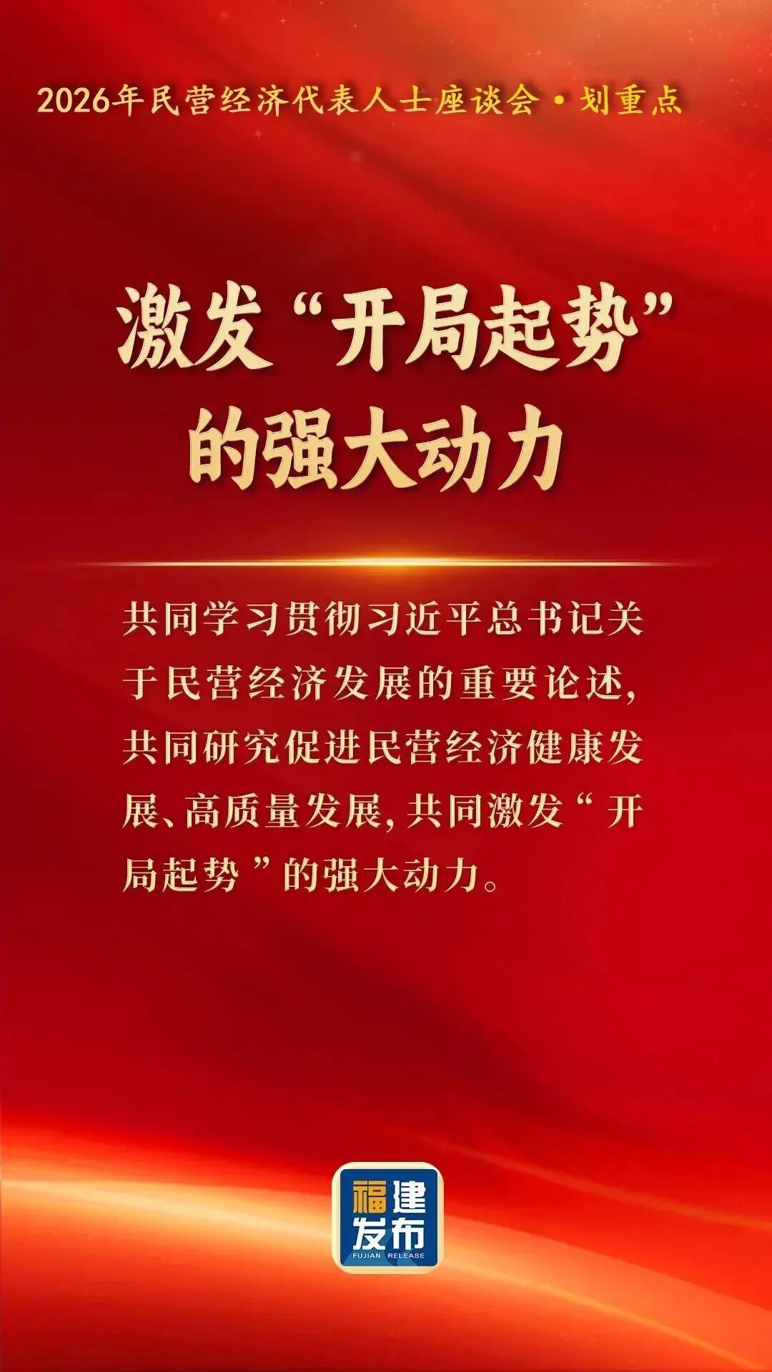 丙午马年开假第一天,2月24日,省委、省政府连续第六年以“新春第一会”形式,在福州召开民营经济代表人士座谈会。会上,省领导与民营企业家共同学习贯彻习近平总书记关于民营经济发展的重要论述,研究促进民营经济健康发展、高质量发展,激发“开局起势”的强大动力,以旗帜鲜明的态度、真真切切的尊重和实实在在的举措,鼓励和支持全省广大民营企业和民营企业家坚定信心、振奋精神、奋勇争先,为实现“十五五”良好开局、奋力谱写新征程新福建建设新篇章作出新的贡献。省委书记、省人大常委会主任周祖翼出席并讲话,省委副书记、省长赵龙主持。省政协主席滕佳材,省委副书记、福州市委书记郭宁宁出席。 让我们通过一组海报 速览会议要点 ↓↓↓