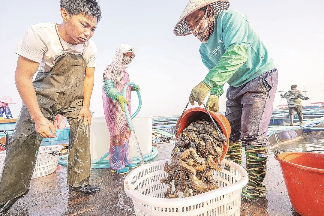 霞浦沙江镇海域,海参养殖户装载捕捞上岸的海参。霞浦是“中国南方海参之乡”,已形成了集育苗、养殖、加工、销售于一体的海参全产业链。资料图片 两会连线 科技赋能,精耕远海蓝色“大牧场” 春潮涌动,蓝海扬帆。近日,记者来到福州新区(长乐区)长屿岛外水域,只见一座巨型钢架平台矗立海面,这是去年底完成的深海养殖平台“航宁2号”。这座深海养殖“巨无霸”预计于今年4月正式投产运营,为福州海洋经济发展再添助力。 “航宁2号”是桩基桁架式钢结构养殖平台,总面积达6250平方米,可承载6万立方米养殖水体,宛如一座“海上牧场”。平台负责人王开木介绍,平台不仅抗风浪能力突出,更配齐现代化、智能化养殖装备,超大容量投饵舱、智能起网机械臂、配套大型冷库一应俱全,年产量可达近千吨,年产值预计突破8000万元。 “未来‘航宁1号’‘航宁2号’双平台联动,仅需6人即可完成值守管理,真正实现‘拎包下海、智能牧渔’,让深远海养殖迈入智能化新时代。”他说。详情>>> 四位一体,铺就创新转化“快车道” 深海微生物制品、海洋新型传感器、海洋碳汇计量等领域突破20余项关键技术,4个项目获省级专项资金支持,与30余家企业达成产业合作意向…… 这一系列亮眼成果,均诞生于一家年轻的高能级科创平台——鹭江创新实验室(以下简称“实验室”)。 实验室于2025年初挂牌成立,由厦门市政府牵头,依托厦门大学和自然资源部第三海洋研究所共建,致力于开展海洋科学与技术领域的高水平原始创新和科技成果汇聚与转化工作,已成为海洋强省建设的重要支撑。详情>>>