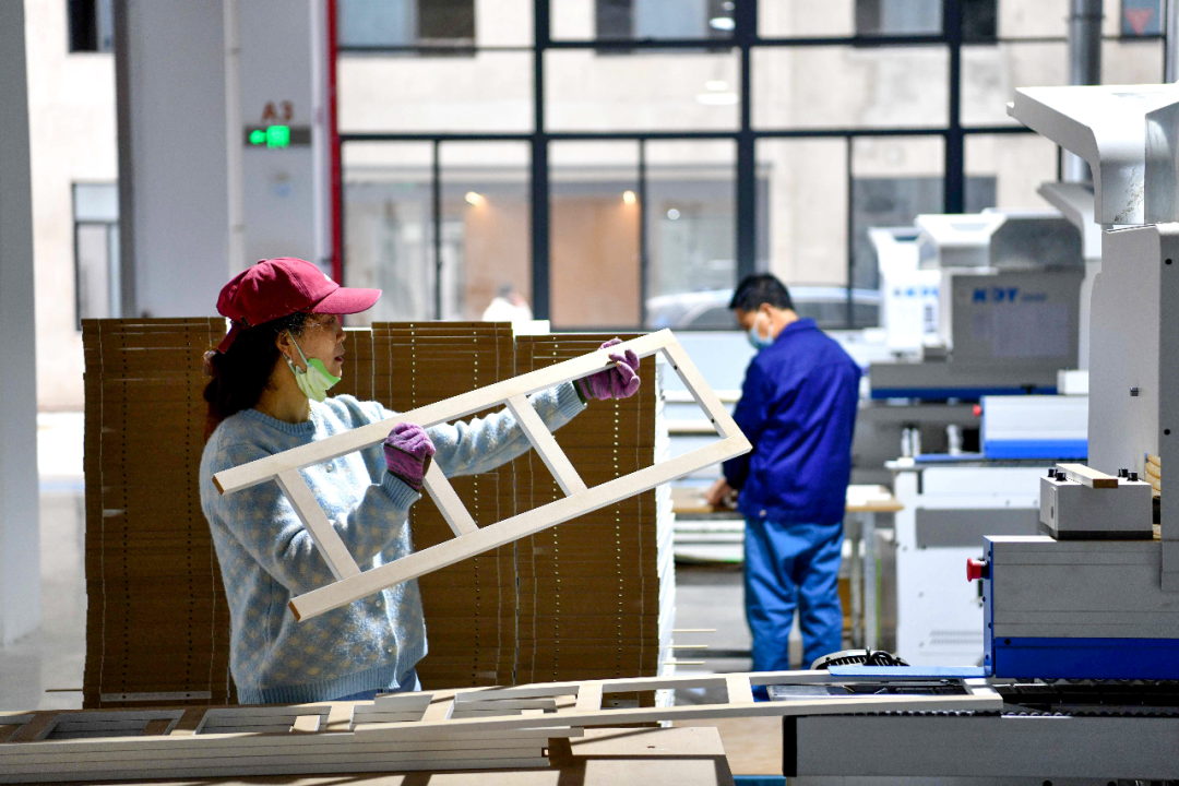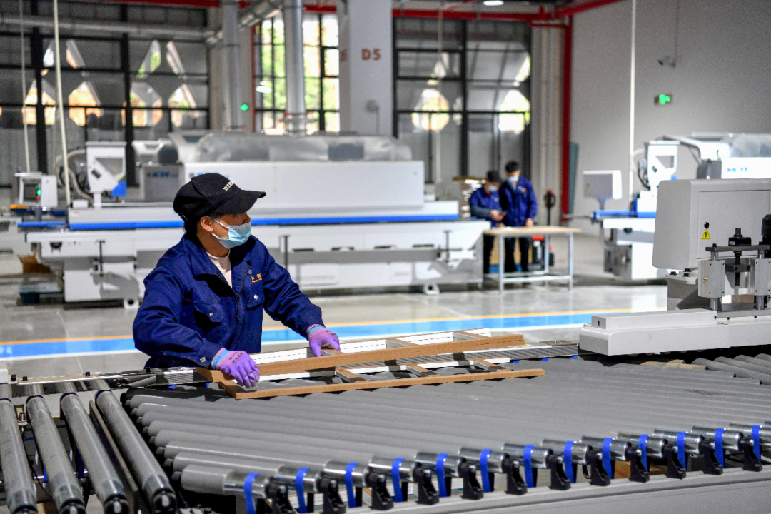 4月8日,在政和县熊山街道鹤林工业园区,福建政和中辉工贸有限公司新车间里,工人将板材放上输送带,13台自动化封边机同步高效作业。