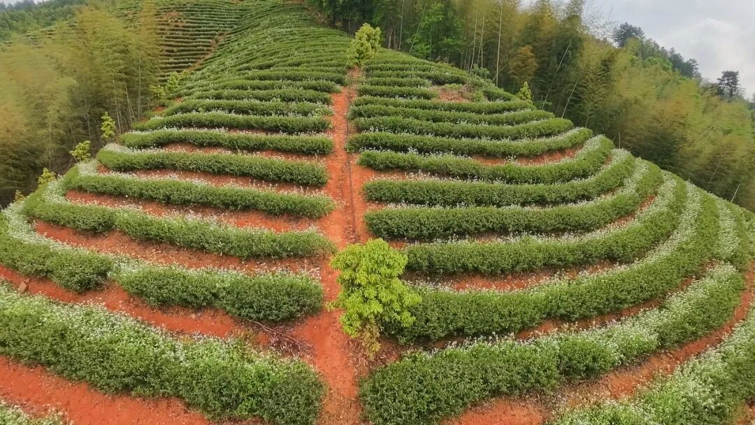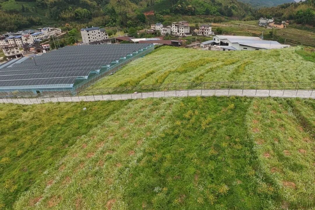 在凤林村桥头桃园,肥田萝卜、苕子等绿肥与果树相间生长,白红相映,蝶舞其间。县农业农村局高级农艺师张礼华介绍,苕子属藤状植物,在桃园覆盖度高,抑草效果好,搭配桃花盛开形成特色景观,观赏效果显著。 除果园、水田外,绿肥种植也在茶山推广。在熊山街道天星坑、大垅田尾坑茶园,青翠茶垄间,白色肥田萝卜花竞相绽放,勾勒出优美田园线条。